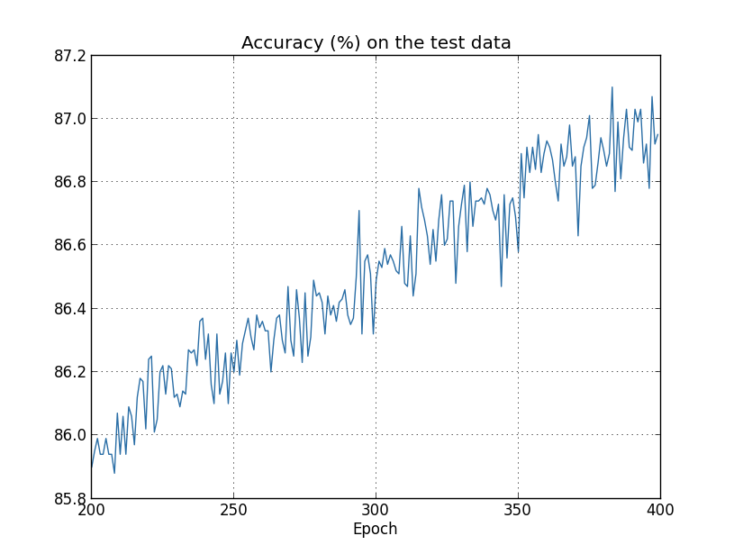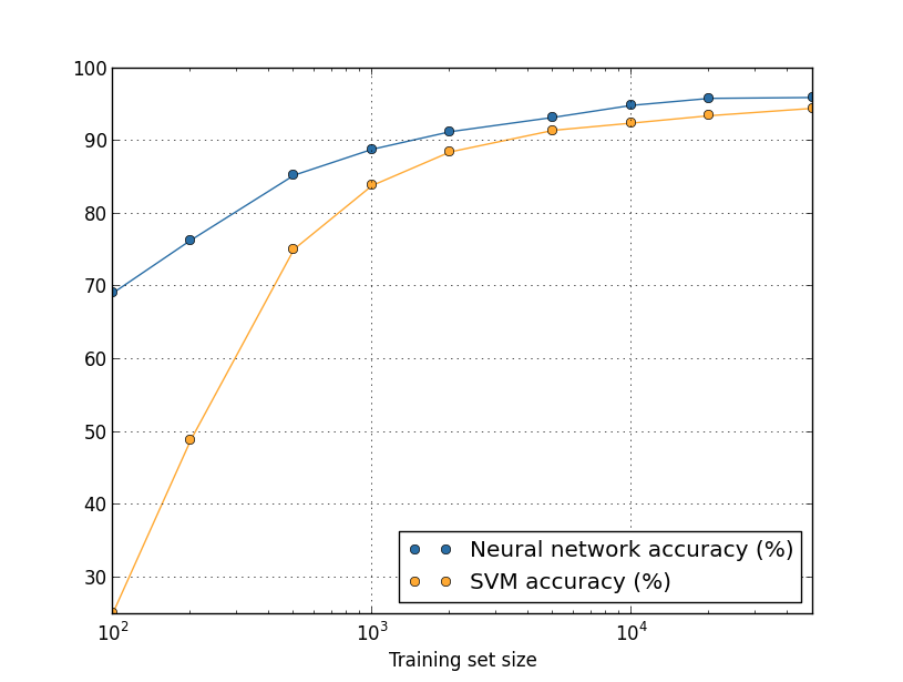 The challenge of setting hyper-parameters has led some people to complain that neural networks require a lot of work when compared with other machine learning techniques. I've heard many variations on the following complaint: "Yes, a well-tuned neural network may get the best performance on the problem. On the other hand, I can try a random forest [or SVM or$\ldots$ insert your own favorite technique] and it just works. I don't have time to figure out just the right neural network." Of course, from a practical point of view it's good to have easy-to-apply techniques. This is particularly true when you're just getting started on a problem, and it may not be obvious whether machine learning can help solve the problem at all. On the other hand, if getting optimal performance is important, then you may need to try approaches that require more specialist knowledge. While it would be nice if machine learning were always easy, there is no a priori reason it should be trivially simple.