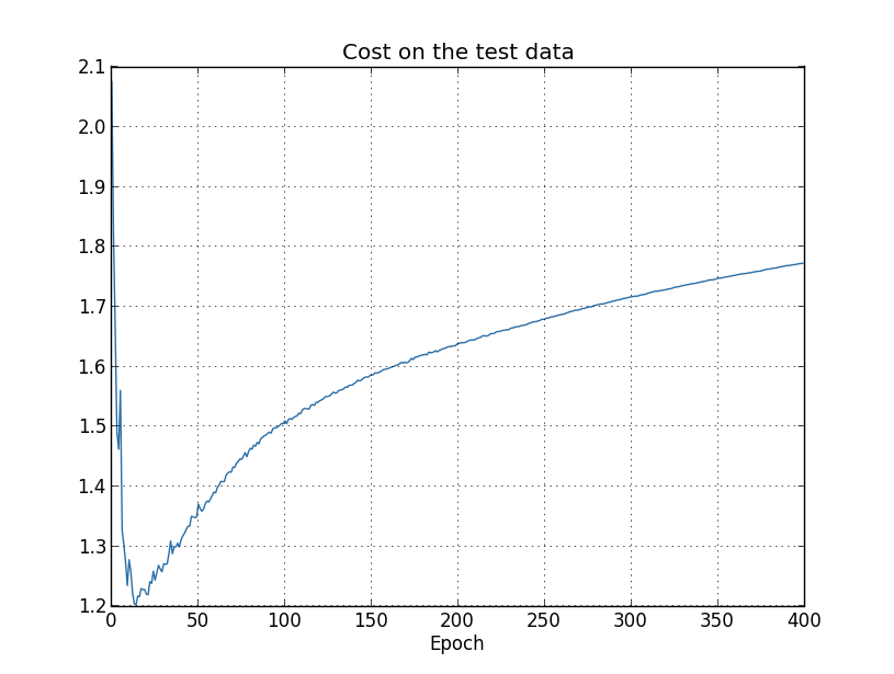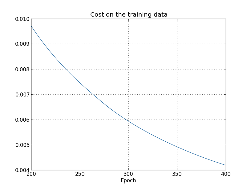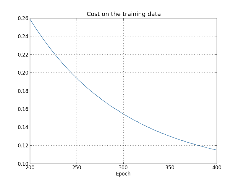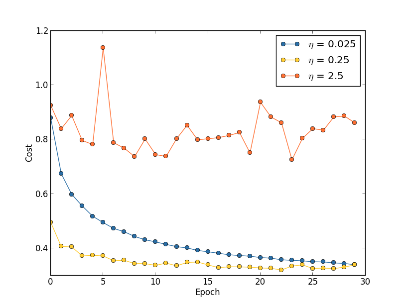 With this picture in mind, we can set $\eta$ as follows. First, we estimate the threshold value for $\eta$ at which the cost on the training data immediately begins decreasing, instead of oscillating or increasing. This estimate doesn't need to be too accurate. You can estimate the order of magnitude by starting with $\eta = 0.01$. If the cost decreases during the first few epochs, then you should successively try $\eta = 0.1, 1.0, \ldots$ until you find a value for $\eta$ where the cost oscillates or increases during the first few epochs. Alternately, if the cost oscillates or increases during the first few epochs when $\eta = 0.01$, then try $\eta = 0.001, 0.0001, \ldots$ until you find a value for $\eta$ where the cost decreases during the first few epochs. Following this procedure will give us an order of magnitude estimate for the threshold value of $\eta$. You may optionally refine your estimate, to pick out the largest value of $\eta$ at which the cost decreases during the first few epochs, say $\eta = 0.5$ or $\eta = 0.2$ (there's no need for this to be super-accurate). This gives us an estimate for the threshold value of $\eta$.