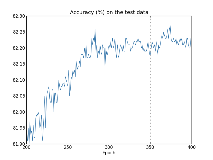 Let's look also at the case where we use $100$ hidden neurons, the cross-entropy, and otherwise keep the parameters the same. In this case we obtain an accuracy of $96.82$ percent. That's a substantial improvement over the results from Chapter 1, where we obtained a classification accuracy of $96.59$ percent, using the quadratic cost. That may look like a small change, but consider that the error rate has dropped from $3.41$ percent to $3.18$ percent. That is, we've eliminated about one in fourteen of the original errors. That's quite a handy improvement.