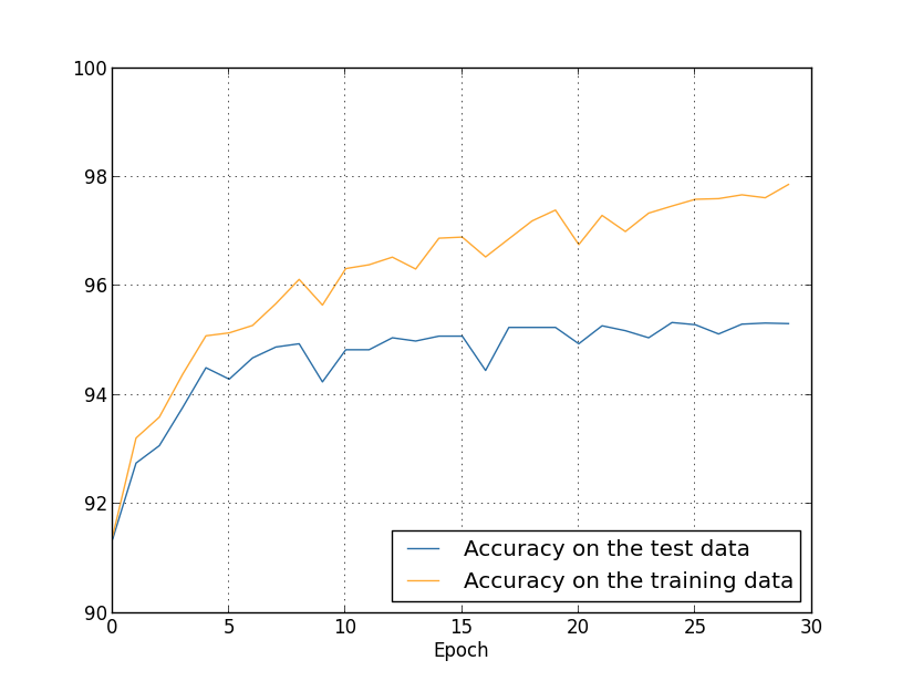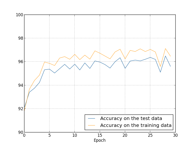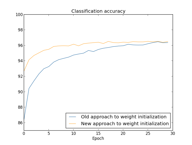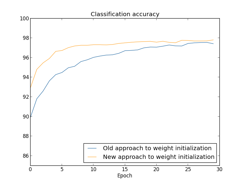 This no-improvement-in-ten rule is good for initial exploration of MNIST. However, networks can sometimes plateau near a particular classification accuracy for quite some time, only to then begin improving again. If you're trying to get really good performance, the no-improvement-in-ten rule may be too aggressive about stopping. In that case, I suggest using the no-improvement-in-ten rule for initial experimentation, and gradually adopting more lenient rules, as you better understand the way your network trains: no-improvement-in-twenty, no-improvement-in-fifty, and so on. Of course, this introduces a new hyper-parameter to optimize! In practice, however, it's usually easy to set this hyper-parameter to get pretty good results. Similarly, for problems other than MNIST, the no-improvement-in-ten rule may be much too aggressive or not nearly aggressive enough, depending on the details of the problem. However, with a little experimentation it's usually easy to find a pretty good strategy for early stopping.