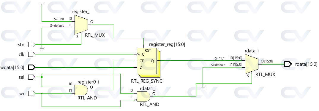 It contains a 16-bit storage element called register which simply gets updated during writes and returns the current value during reads. The register is written when sel and wr are high on the same clock edge. It returns the current data when sel is high and wr is low.