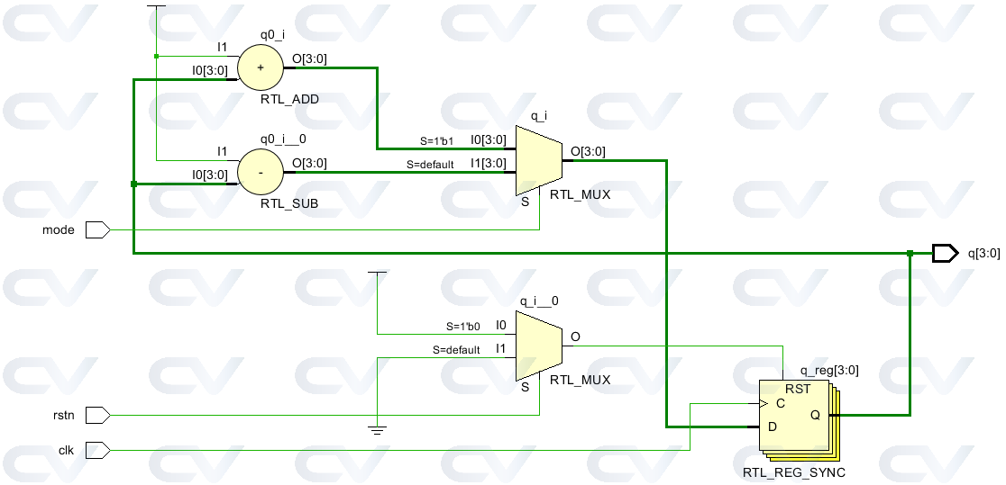Shown below is the synthesized output and it is worth to note that q got implemented as a 4-bit flop which has a pin CE to enable the flop. Note that this flop is enabled only when mode is 1 or 2 and not for other values. Output q is fed back through an adder and subtractor block into the input of the same flop through a mux which is again controlled by mode .