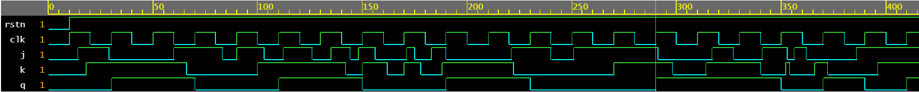 Note from the simulation wave that at the posedge of clock, output q changes value based on the state of inputs j and k as given in the truth table.